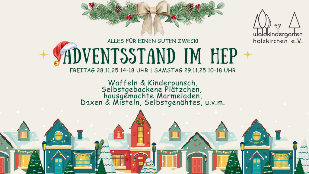 Am Freitag den 28.11.25 von 14-18 Uhr und am Samstag den 29.11.25 von 10-18 Uhr ist es wieder so weit, denn auch dieses Jahr wird es in der Vorweihnachtszeit wieder einen Verkaufsstand im Holzkirchener Einkaufszentrum HEP geben. Die Familien werden selbstgebackene Plätzchen und anderes Selbstgemachtes, wie Marmeladen, Chutneys und Nähwaren am Stand anbieten. Auch Daxen & Misteln werden wieder angeboten! Auch dieses Jahr können sich die Besucher auch über Punsch und Waffeln freuen! Dabei kommen alle Erlöse dem Waldkindergarten Holzkirchen e.V. zugute! Auch wer sich über den Waldkindergarten informieren möchte, ist herzlich am Stand willkommen, um sich mit den Eltern auszutauschen! Für die Kinder wird es verschiedene Aktivitäten am Stand geben!